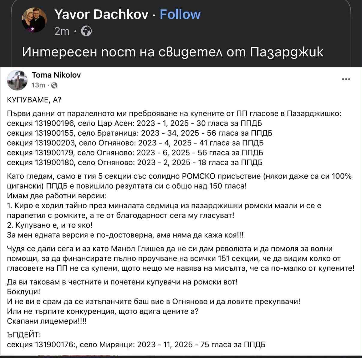 Чудя се дали сега аз като Манол Глишев да не си дам революта и да помоля за волни помощи, за да финансирам пълно проучване на всички 151 секции, че да видим колко от гласовете на ППДБ не са купени, щото нещо ме навява на мисълта, че са по-малко от купените!